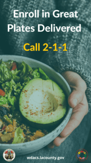 Individuals who are interested in receiving services may apply for “Great Plates Delivered” by calling 2-1-1 or visit wdacs.lacounty.gov .