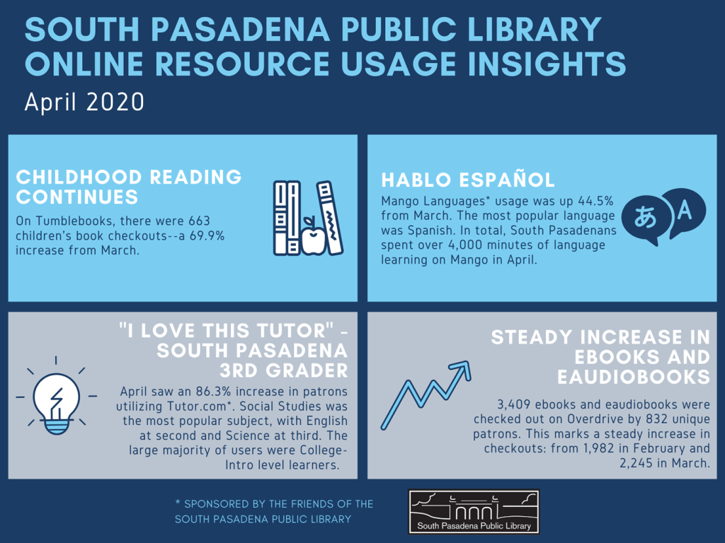 Since the Library closed to the public on March 20th, staff have been tracking use of digital resources. We are happy to report that usage has increased dramatically, with library cardholders taking advantage of tutoring and homework help, film streaming, language learning, ebooks and eaudiobooks and more. The Library’s digital collections can be explored on our website. We are also pleased to announce that we received a grant of $3,000 for “crisis collection funding” from the California State Library, which will allow us to purchase additional ebooks and eaudiobooks that will be available through the Overdrive platform. Many of these resources are funded by the non-profit Friends of the South Pasadena Public Library, and we thank them for their support.
