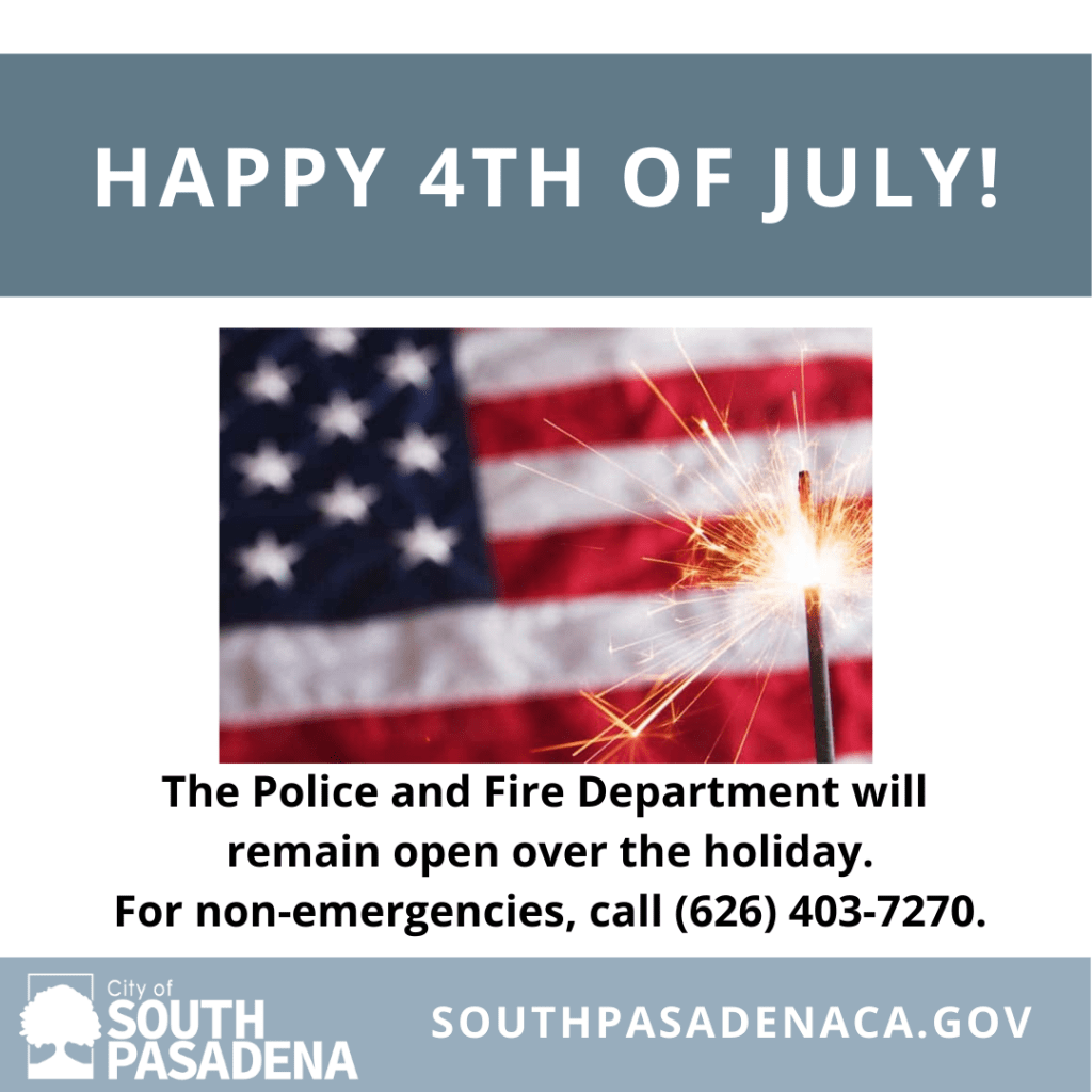 The City of South Pasadena wants to wish all resident a safe and fun Fourth of July. Please continue to social distance and wear a face covering in public.