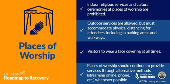 For the health and safety of both worshippers and the wider community, LA County reminds all residents that religious services can continue to take place outdoors with face coverings and physical distance.