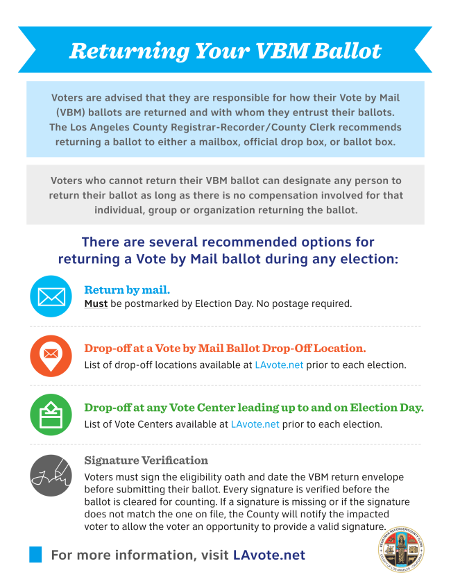 All Los Angeles County Voters are encouraged to vote by mail to help prevent the spread of COVID-19. The County will mail all registered voters a ballot. It is important your information is correct, if you’ve recently moved or changed any information, please visit LAVote.netto receive your ballot. The last day to register to vote is October 19. You can always check your registration status with registration status tool here.