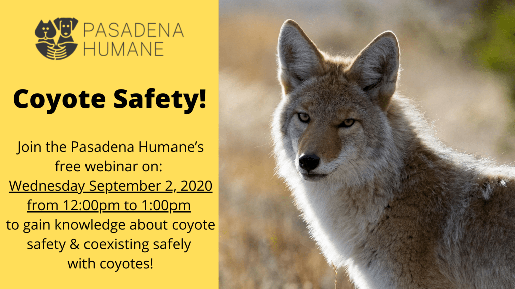 Concerned about neighborhood coyotes? Interested in learning how to help keep them away? Then join this family-friendly Coyote Safety webinar on Wednesday, September 2, 2020 from 12pm to 1pm! Pasadena Humane’s expert Wildlife Manager will share information about the urban coyote and demonstrate humane hazing techniques so that you can peacefully – and safely – coexist with coyotes.