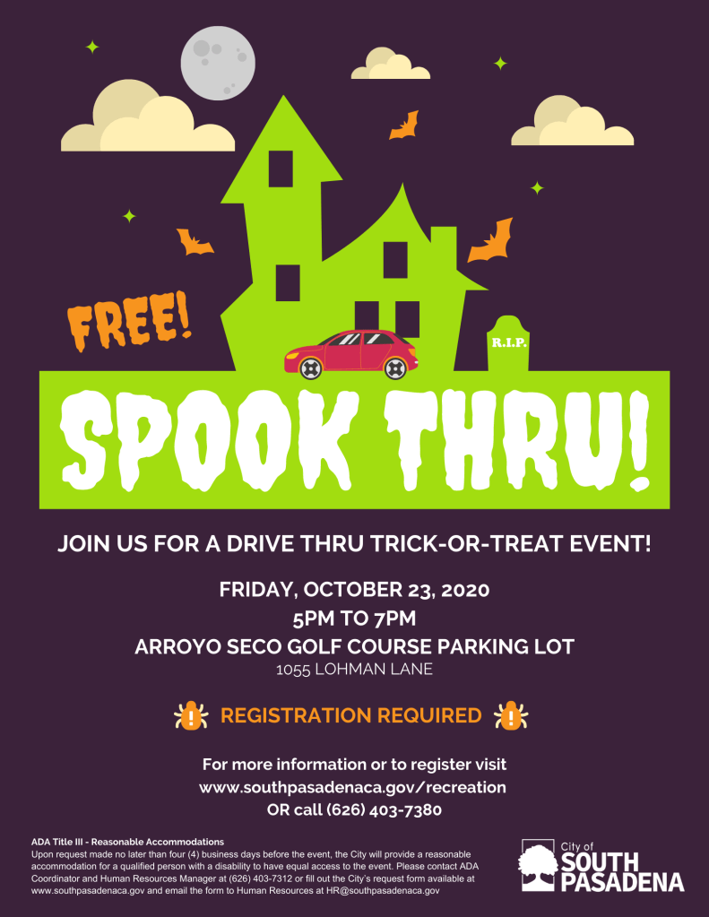 | Spook Thru! Friday, October 23, 2020 5:00PM to 7:00PM Arroyo Seco Golf Course Parking Lot 1055 Lohman Lane, SP, CA 91030 | |