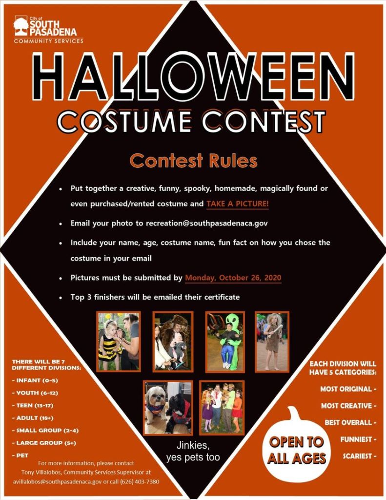 In an effort to get people excited about the holidays, the City of South Pasadena will be hosting an online costume contest. To participate, submit a photo of yourself, your pet or your group in full costume to recreation@southpasadenaca.gov by Monday, October 26, 2020. Please make sure all costumes are family friendly. For contest rules, please see the attached flyer. For more information, please contact the Recreation Division at (626) 403-7380