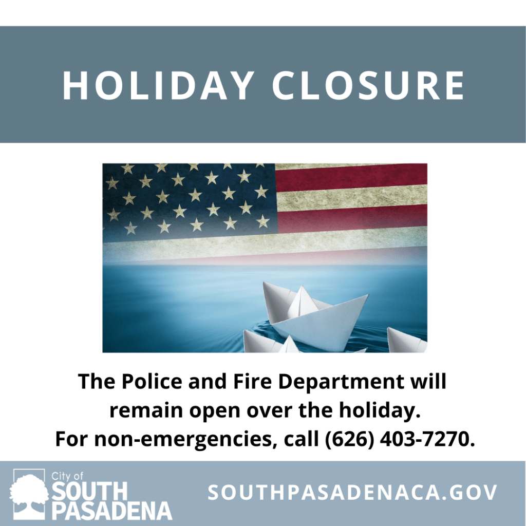 Both the South Pasadena Police and Fire Departments will have staff available to assist the public. For non-emergency assistance, you may contact the Police Department at (626) 403-7270, while the Fire Department can be reached at (626) 403-7300