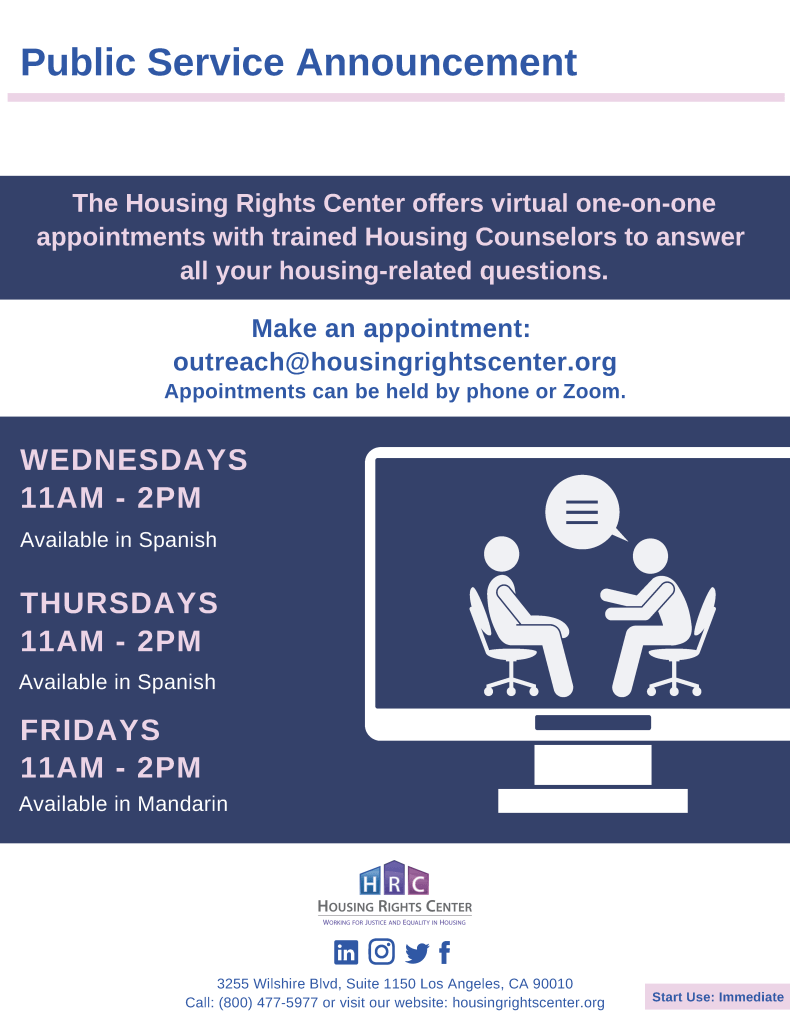 Housing Rights Center is hosting weekly online housing clinics and staff are ready to answer any housing related questions which residents may have. Appointments are available Wednesday – Friday from 11AM – 2PM. Residents can schedule an appointment at outreach@housingrightscenter.org to meet with a housing counselor.