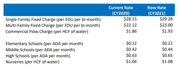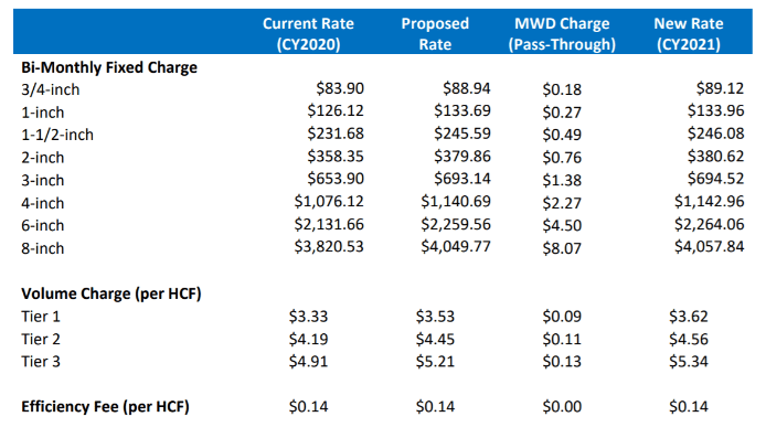 - Water Rates for 2021 will increase by approximately 6.2% for the bi-monthly fixed charge and 8.8% for the volume charge.