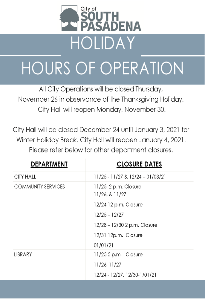 Both the South Pasadena Police and Fire Departments will have staff available to assist the public during all Holiday closures. For non-emergency assistance, you may contact the Police Department at (626) 403-7270, while the Fire Department can be reached at (626) 403-7300