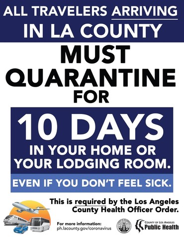 Because of the likelihood of exposure to COVID-19 while traveling outside of L.A County, for everyone that traveled or are planning to travel back into L.A. County, you must quarantine for 10 days. If you start to experience any symptoms or have a positive test, isolate for 10 days and until you are fever-free for 24 hours.