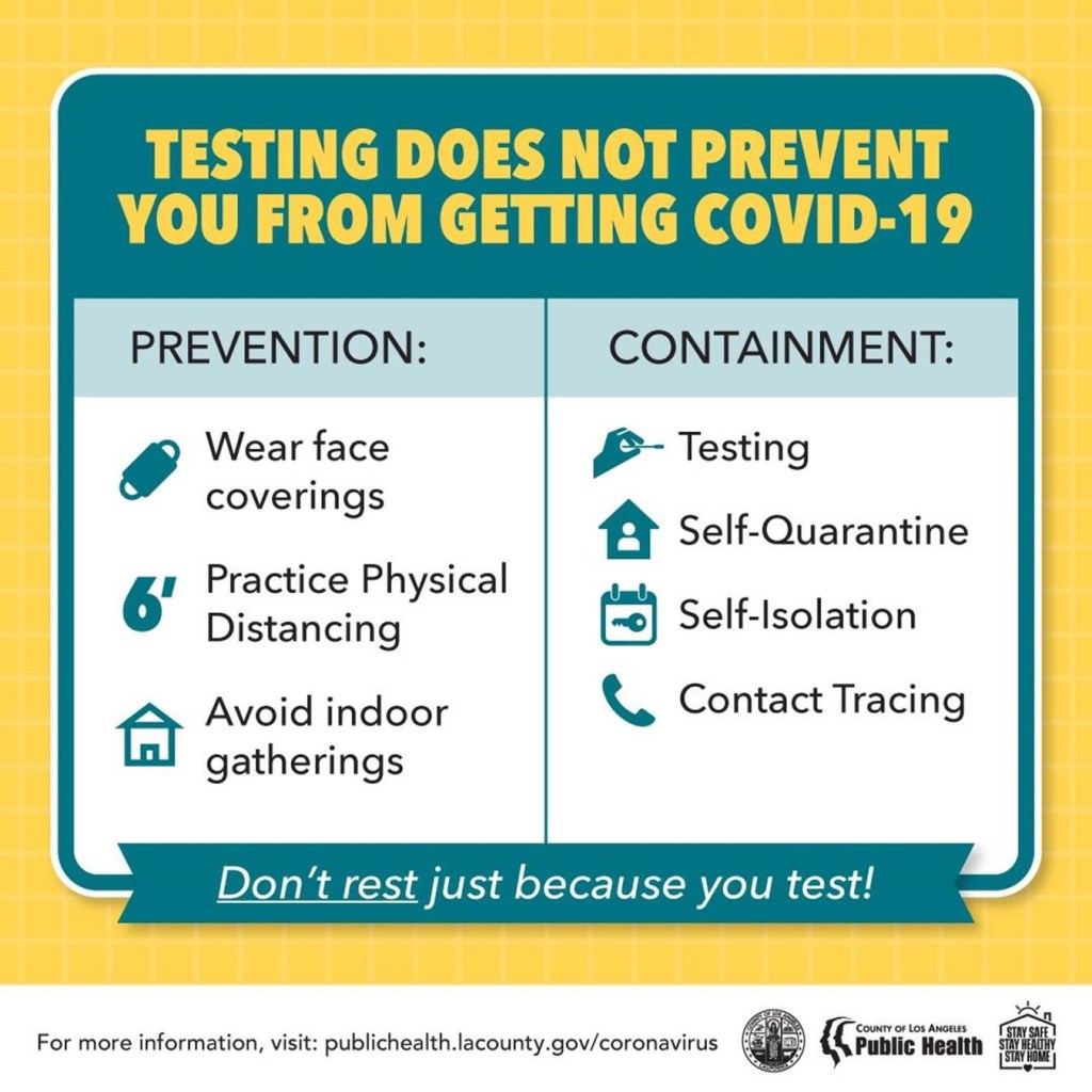 Testing does not prevent COVID-19 and is a tool that should be used together with other public health guidelines. Stay home as much as possible, avoid gatherings and wear your face covering whenever outside your home.
