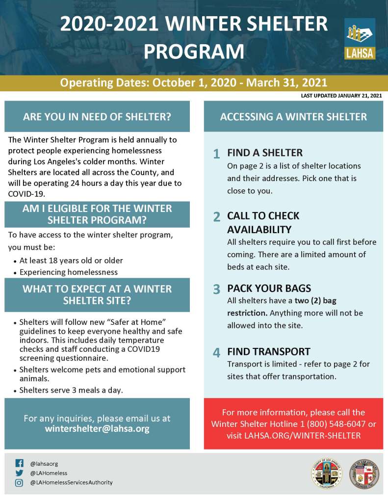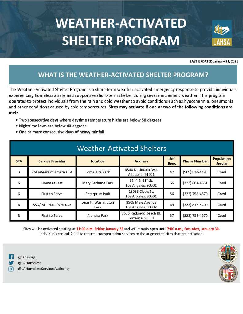 The Los Angeles Homeless Services Authority (LAHSA) Weather-Activated Shelter Program is a short-term weather activated emergency response to provide individuals experiencing homeless a safe and supportive short-term shelter during severe inclement weather. This program operates to protect individuals from the rain and cold weather to avoid conditions such as hypothermia, pneumonia and other conditions caused by cold temperatures.