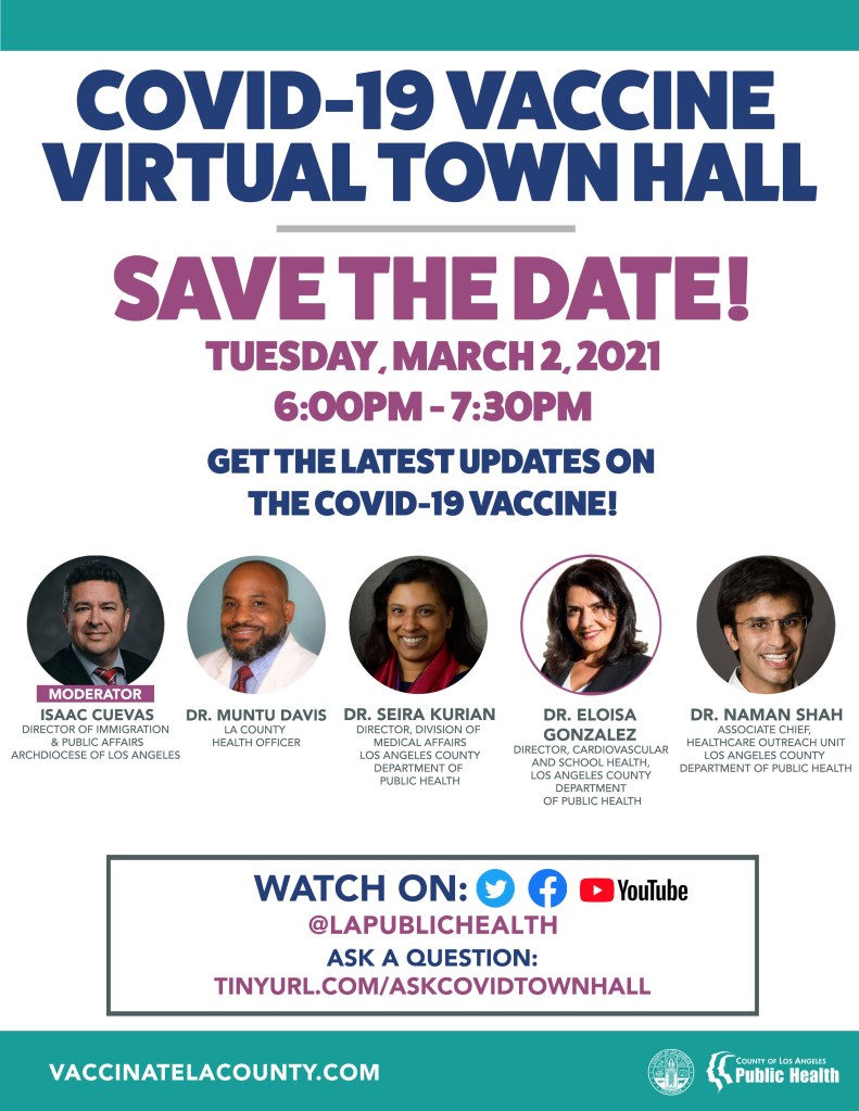SAVE THE DATE: Please join the Department of Public Health, March 2 at 6pm for the COVID-19 Virtual Town Hall Event. Dr. Muntu Davis, Dr. Paul Simon, Dr. Seira Kurian, Dr. Eloisa Gonzalez and Dr. Naman Shah will be discussing the latest updates on the COVID-19 vaccine.