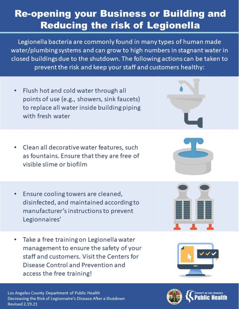 Making plans to open your building back up? Make sure to address stagnant water which is a breeding source for the bacteria Legionella—the germ that causes Legionnaires’ Disease.
