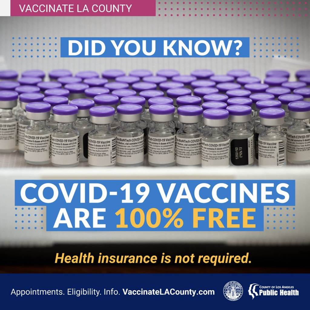COVID-19 vaccines are 100% free and health insurance is NOT required. For more information visit http://VaccinateLACounty.com