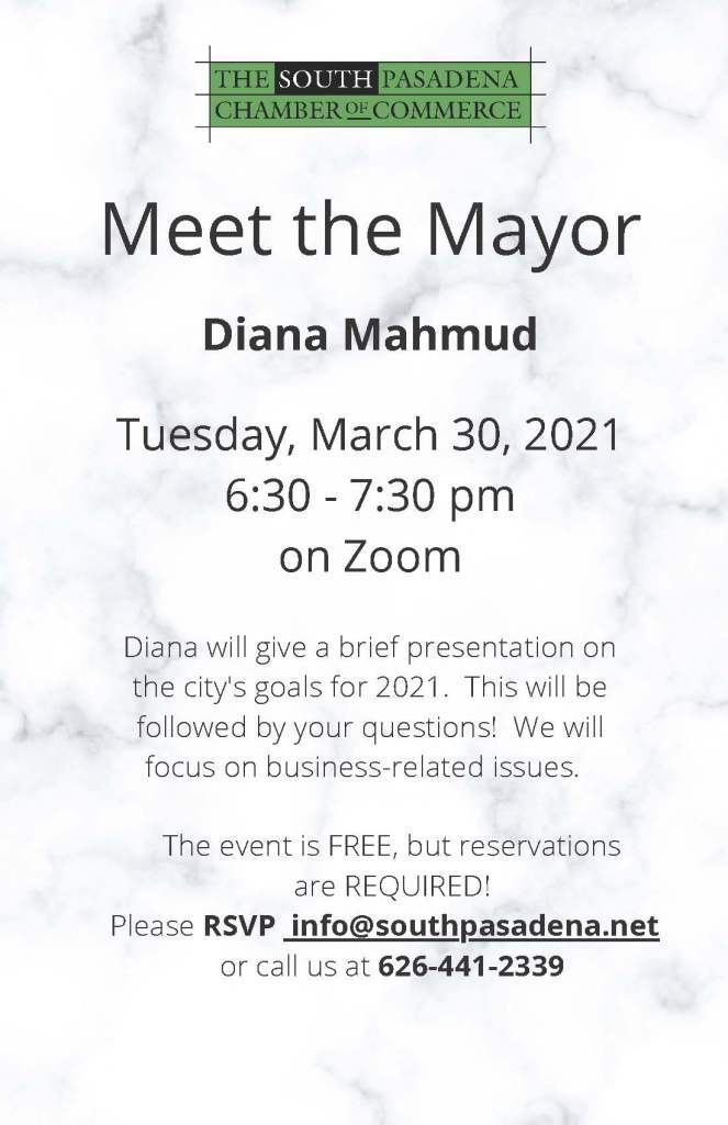 Virtual Meet the Mayor, 03/30 at 6:30 pm CityHallScoop no comments March 25, 2021 Chamber of Commerce Website: https://southpasadena.net/ 3/25/2021 Share this: Share on X (Opens in new window) X Share on Facebook (Opens in new window) Facebook Like Loading... Related