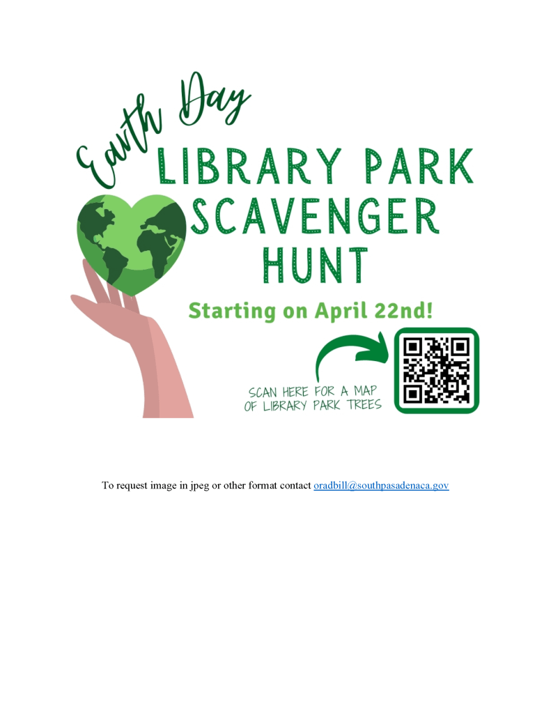 With the Library Park Tree Scavenger Hunt, the library’s extensive collections, and an Earth Day-themed Take and Make Craft Kit, budding eco-activists can celebrate Earth Day, spend time in nature, satisfy their curiosity about the natural world, and find great fulfillment—all thanks to the library and the generous support of the Friends of the South Pasadena Public Library!