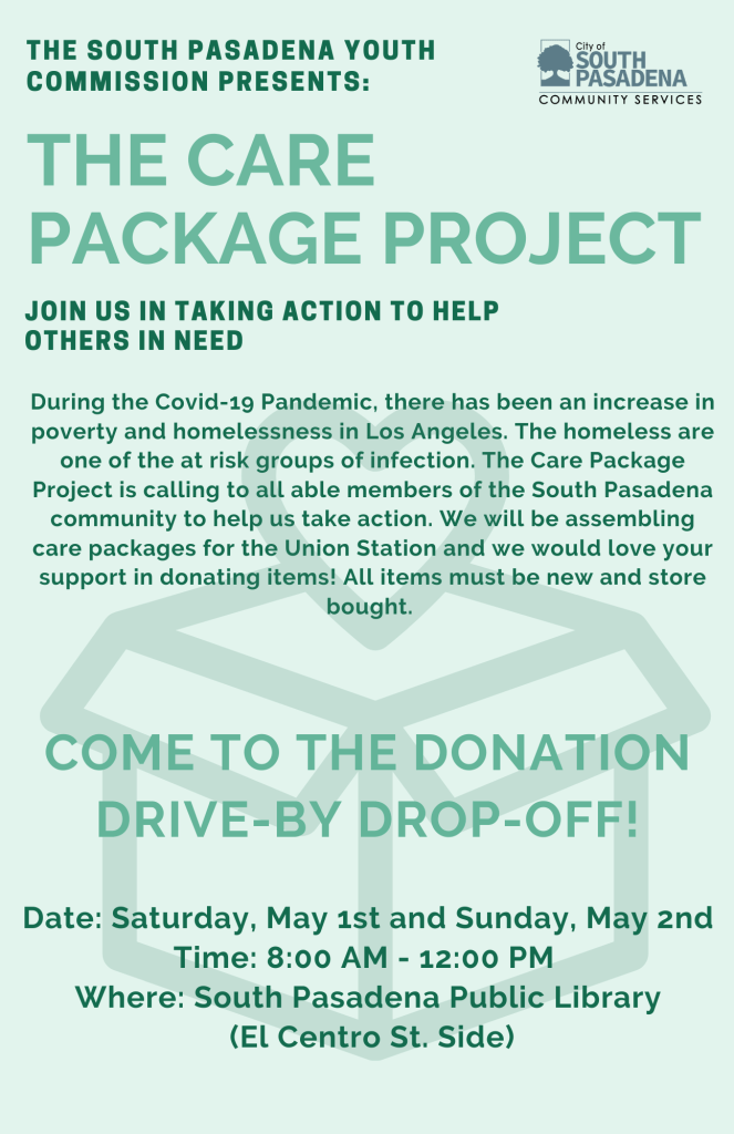 The South Pasadena Youth Commission will be hosting a donation drive-by drop-off for supplies to create care packages for unhouse individuals. Donations will be accepted on May 1 and May 2 from 8 a.m. to 12 p.m. at the South Pasadena Library/Senior Center. For more information please call (626) 403-7380 or visit southpasadenaca.gov .