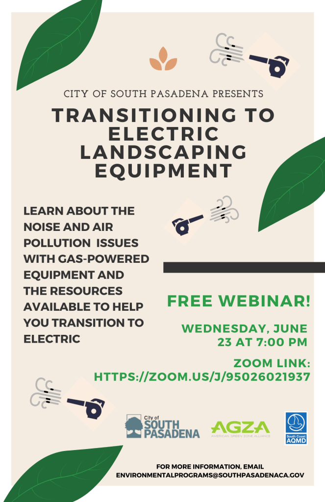 Ditch that noisy, polluting, gas-powered leaf blower and come learn how to transition to low-noise, zero-emission electric landscaping equipment! The City of South Pasadena, in partnership with the American Green Zone Alliance (AGZA), will be hosting a free Zoom webinar, “Transitioning to Electric Landscaping Equipment,” on June 23, 2021 at 7pm. Residents can learn how to transition from gas powered landscaping equipment, such as leaf blowers, to electric powered equipment. AGZA will discuss the air and noise pollution issues with gas powered equipment, the electric equipment that is currently available, and the cost comparison between gas and electric. Residents will have the opportunity to ask questions and learn more about the City’s plans to prohibit the use of gas powered leaf blowers. Join the Zoom Webinar via link: https://zoom.us/j/95026021937 or Meeting ID: 950 2602 1937.