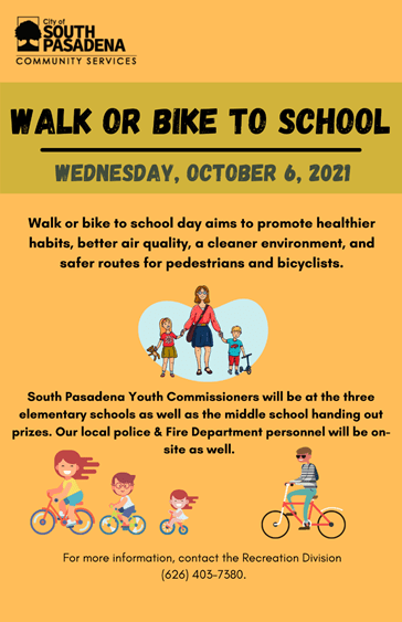 In conjunction with #CleanAirDayCA, students attending South Pasadena Elementary Schools and Middle School can join us in celebrating Walk or Bike to School Day on October 6th, 2021 from 7:30am to 8:30am. By walking to school or biking, not only are you celebrating #CleanAirDayCA but are also promoting good health, better air quality, and creating a cleaner environment for us all to enjoy.