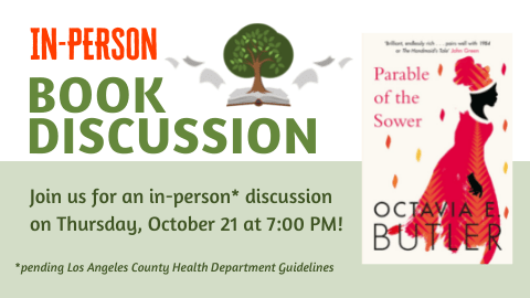 The Library’s Citywide reading program, One City One Story, winds up with two librarian-led discussions of our 2021 title, Parable of the Sower, by Octavia Butler. Borrow the ebook, eaudiobook, or a hard copy from the Library. This Thursday, October 21 at 7PM, join us for the in-person book discussion in the Library Community Room at 1115 El Centro Street. A virtual discussion over Zoom will take place on November 10. Register on our Eventbrite page. Masks are required.