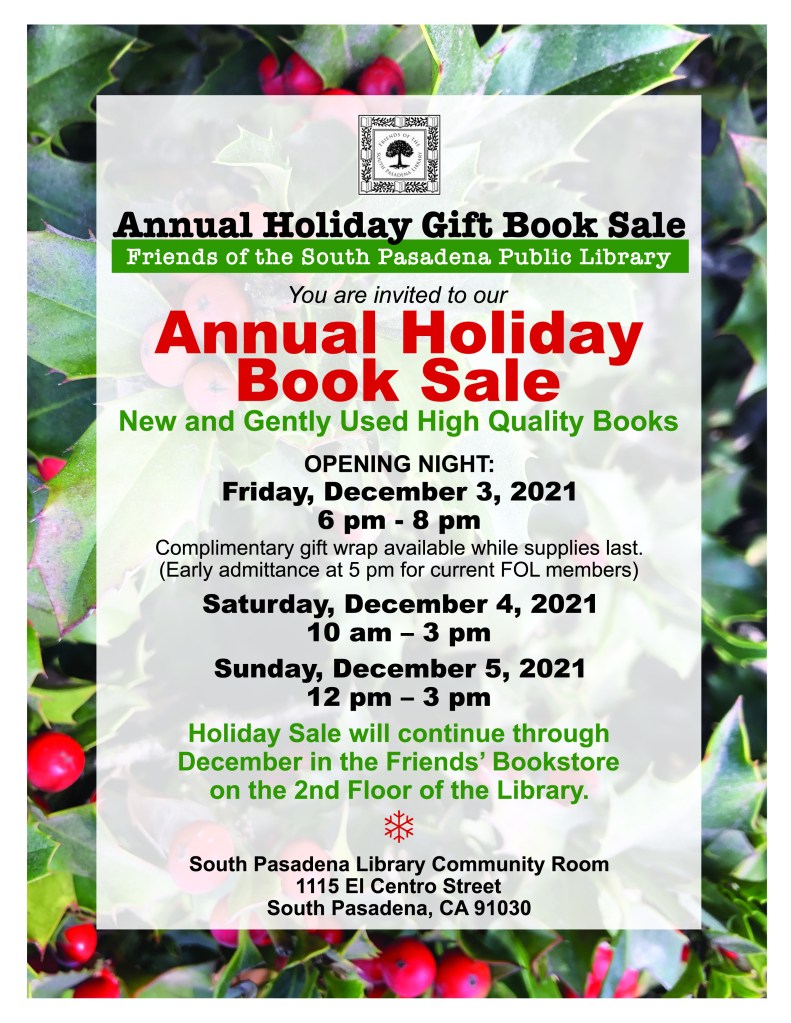 Head to the South Pasadena Library for our Annual Holiday Book Sale! The sale will include new and gently used high quality books across various categories. We will also be offering complimentary gift wrap while supplies last. These books will make the perfect Holiday gift for those who love to read.