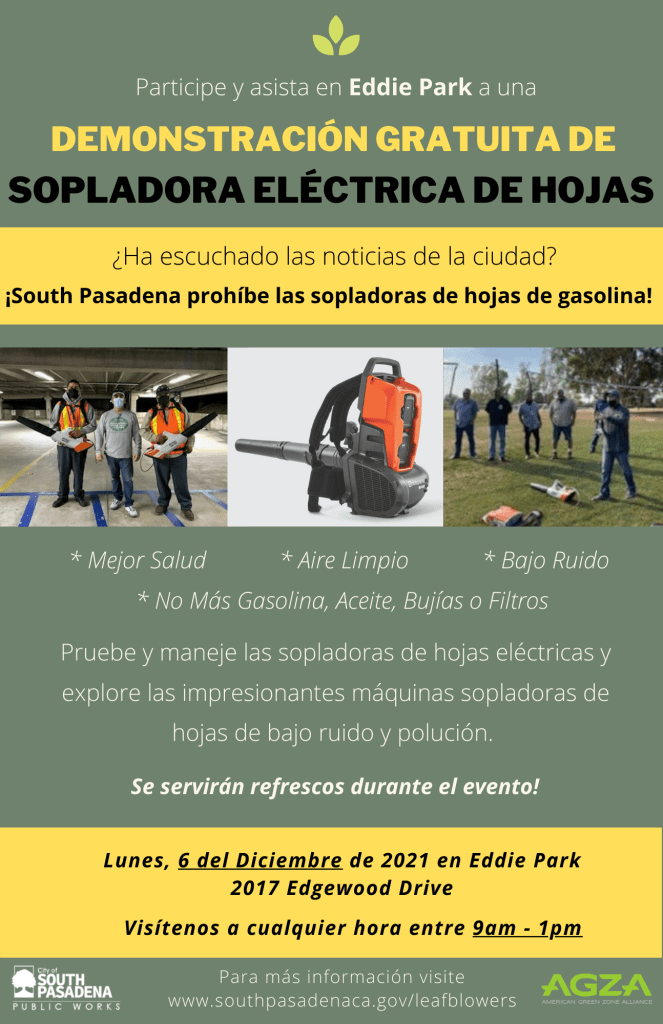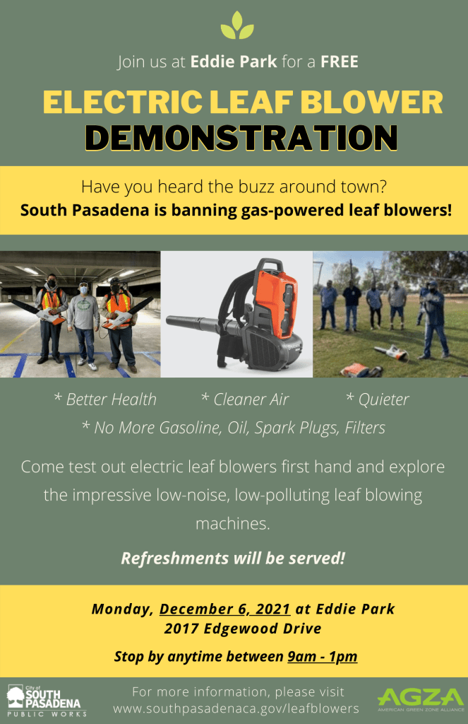 Join us on December 6th at Eddie Park for an Electric Leaf Blower Demonstration from 9am-1pm. This is a free event to provide an opportunity for everyone to test out the all new electric leaf blowers first hand!