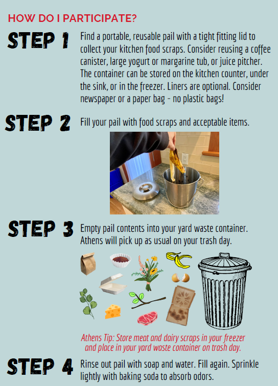 Residents will be required to separate their food scraps and food-soiled paper and discard them with their yard waste instead of their regular trash. The food scraps and food-soiled paper will be picked up by Athens as usual, but instead of it going to a landfill, these organics will be recycled into compost which will significantly reduce greenhouse gas emissions!