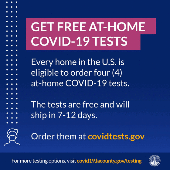 The federal government recently announced that every home in the U.S. is eligible to order 4 free at-home COVID-19 tests. The tests are completely free and can be now ordered at covidtests.gov. Orders typically ship in 7-12 days.