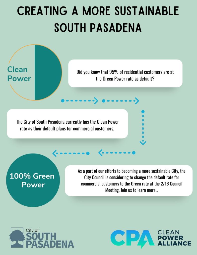 The South Pasadena City Council is considering changing the default Clean Power Alliance energy produce for commercial customers, from the current Clean rate (50% renewable energy) to the Green rate (100% renewable energy). If this is approved, the new rates will become effective in October, 2022. As before, all customers have the choice to change their rate selection, they will be transitioned to the default rate unless they contact Clean Power Alliance to opt into another tier.