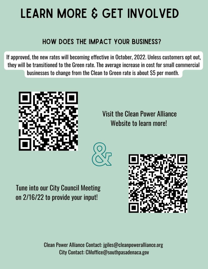 More information is available at CleanPowerAlliance.org/rate-options . Customers can compare the rate differential for the different energy products for their own business, learn how to opt in or out of an energy product, and get other information and details. CPA indicates that the average increase in cost for small commercial businesses to change from the Clean to the Green product is about $5 per month. We also welcome input from our businesses at our 2/16/22 Council Meeting that could be accessed through the City’s website.