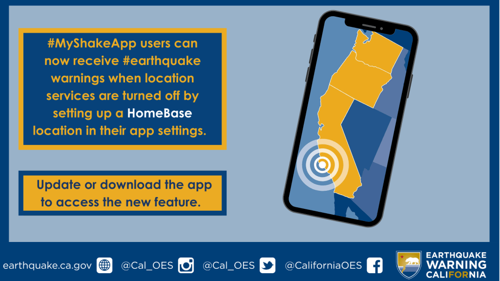 #MyShakeApp users can now receive #earthquake alerts without location services. Setup your HomeBase to receive earthquake alerts. Learn more at earthquake.ca.gov.
