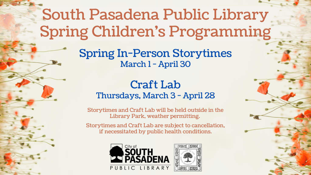 The South Pasadena Public Library is excited to announce the return of in-person programming for children! There will be Preschool Storytimes, Toddler Storytimes, and Family Storytimes held outside in the Library park. For more information, read the attached press release: