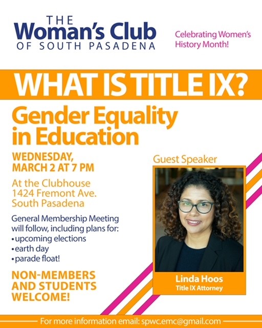 Happy first day of Women’s History Month! On March 2, at 7PM, The Woman’s Club of South Pasadena will be hosting the following event to bring awareness to Title XI and Gender Equality in Education. For more information, please email spwc.emc@gmail.com.