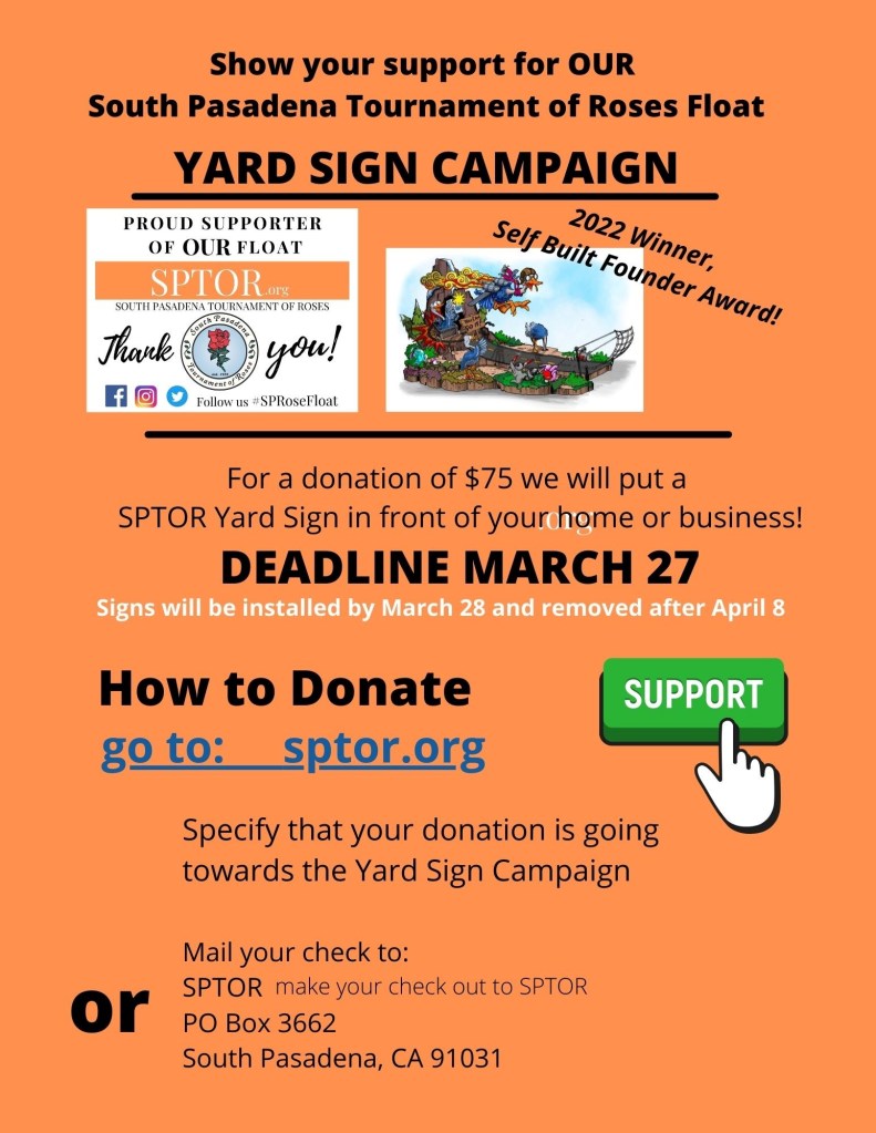 Supporters of South Pasadena’s float in the annual Rose Parade are being asked to make a donation for a yard sign that will be placed in front of homes and businesses.