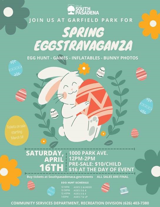 Pre-sale tickets are now available at $10/child and $16 the day of the event. By tickets by visiting Southpasadenaca.gov/events.