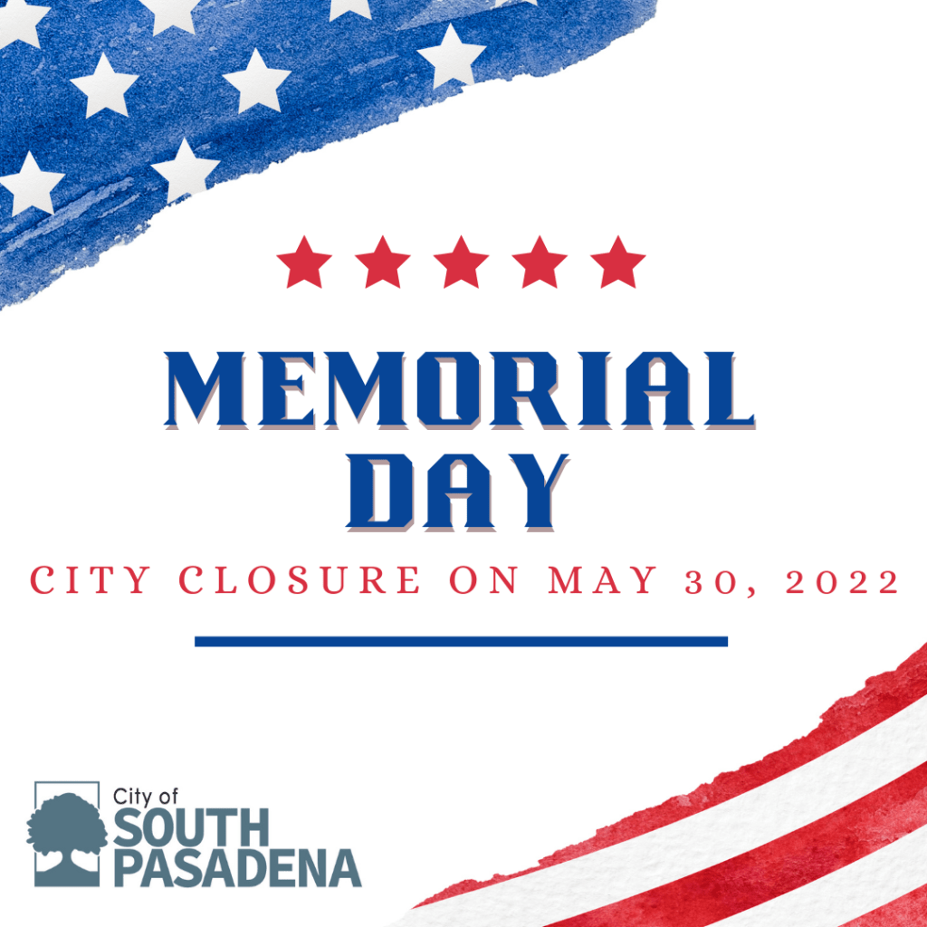 The City of South Pasadena would like to remind our residents that we will be closed on May 30, 2022 in observance of Memorial Day. Both the South Pasadena Police and Fire Departments will have staff available to assist the public. For non-emergency assistance, you may contact the Police Department at (626) 403-7270, while the Fire Department can be reached at (626) 403-7300.