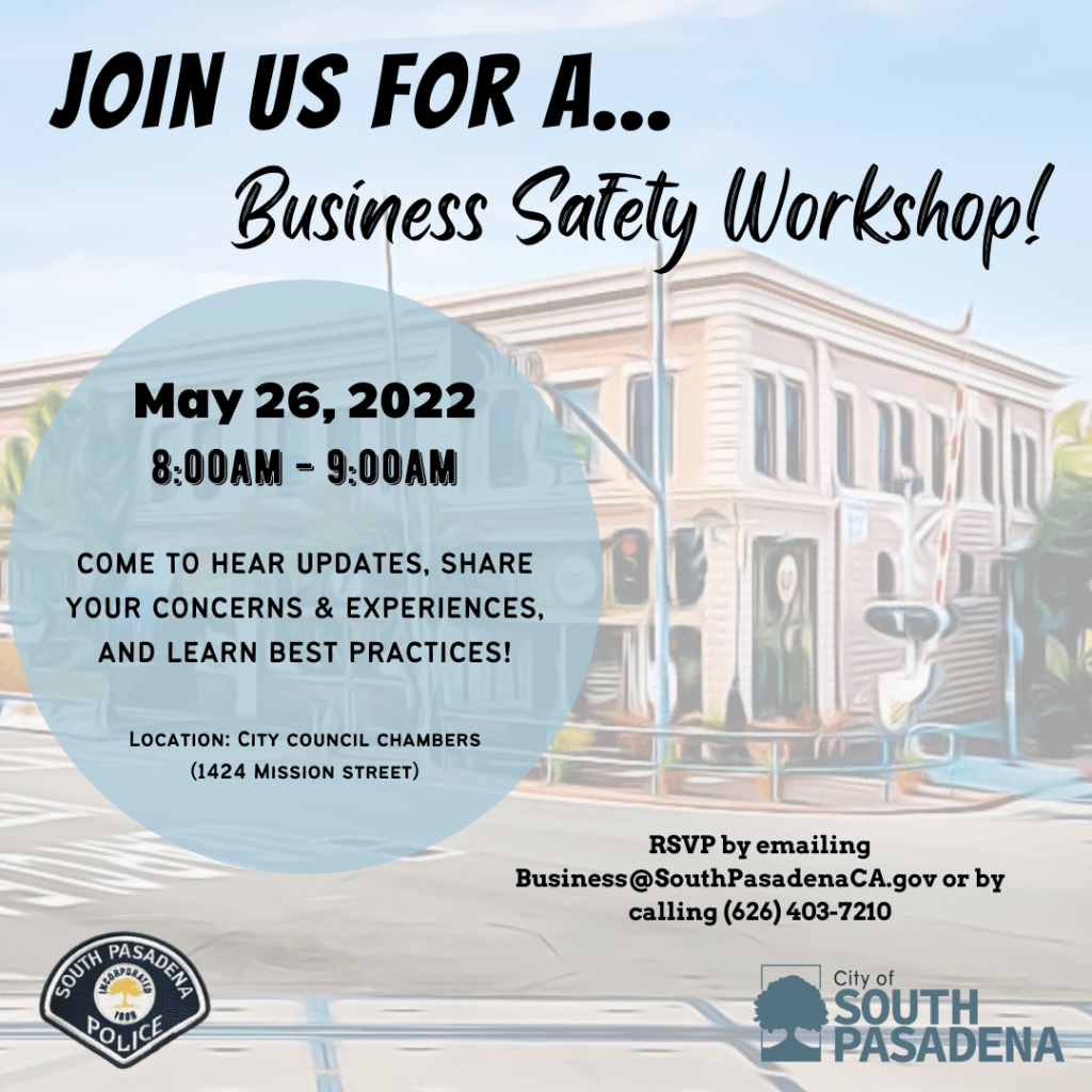 Join us this Thursday on May 26 from 8am-9am in the City Council Chambers (1424 Mission Street) for a Business Safety Workshop! The workshop will include updates and tips from our Police Department regarding business safety and they will also be there to answer any questions that our local business owners have. To RSVP, email business@southpasadenaca.gov or call the City Manager’s Office at (626) 403-7210.
