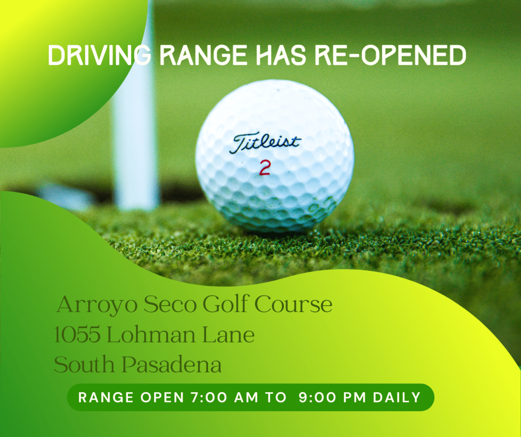 The Arroyo Seco Golf Course Driving Range has re-opened after damage to poles and netting during the January wind storms. The driving range opens at 7:00 AM and closes at 9:00 PM daily. For further information, contact the Community Services Department at 626-403-7380.