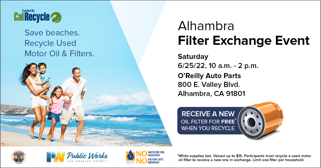Our neighbors in Alhambra are hosting an Oil Filter Exchange Event on Saturday, June 25 from 10am-2pm! You’re invited to bring in your used motor oil and used oil filters for recycling. Receive one FREE new oil filter by bringing in your used oil filter. The event will be at O’Reilly Auto Parts located at 800 E. Valley Blvd in Alhambra.