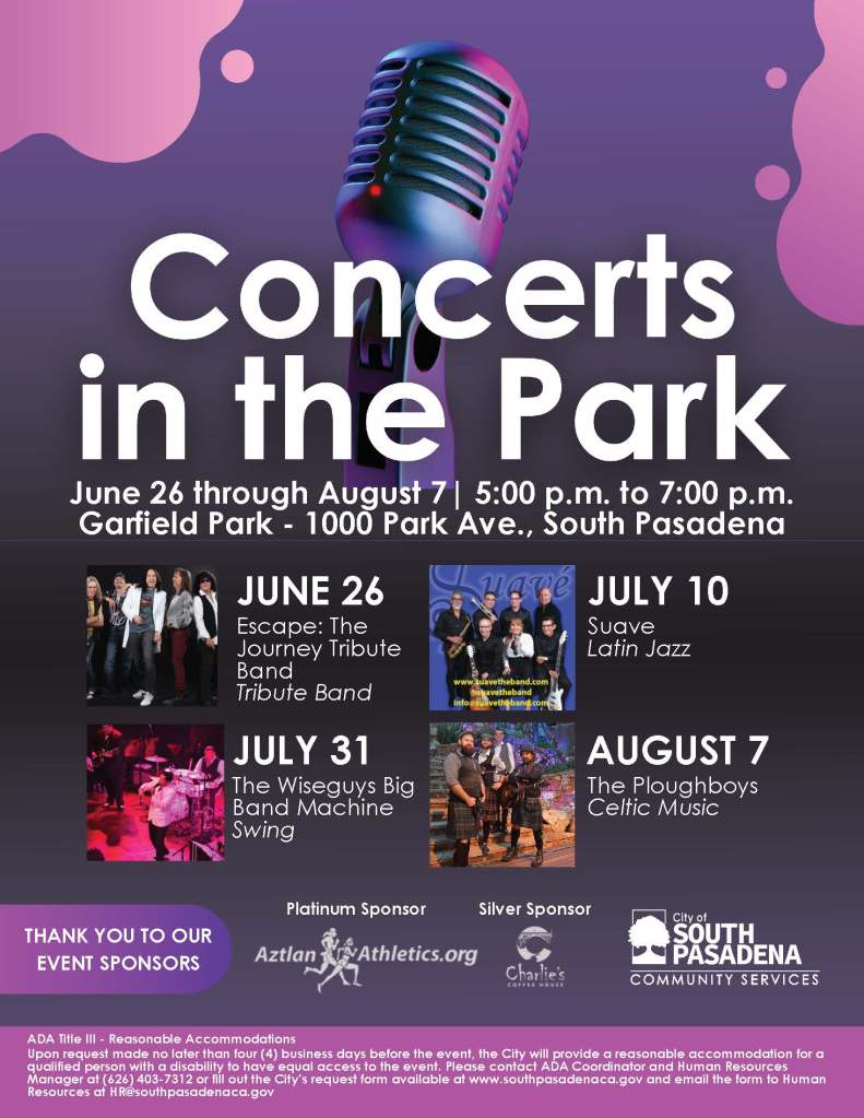 Concerts in the Park is held at Garfield Park, located at 1000 Park Avenue, South Pasadena. The current schedule of performances includes Escape: The Journey Tribute Band on Sunday, June 26, Suavé on Sunday, July 10, The Wiseguys Big Band Machine on Sunday, July 31, and the series concludes with a throwback showing of The Ploughboys on Sunday, August 7. All concerts run from 5:00 p.m. to 7:00 p.m.