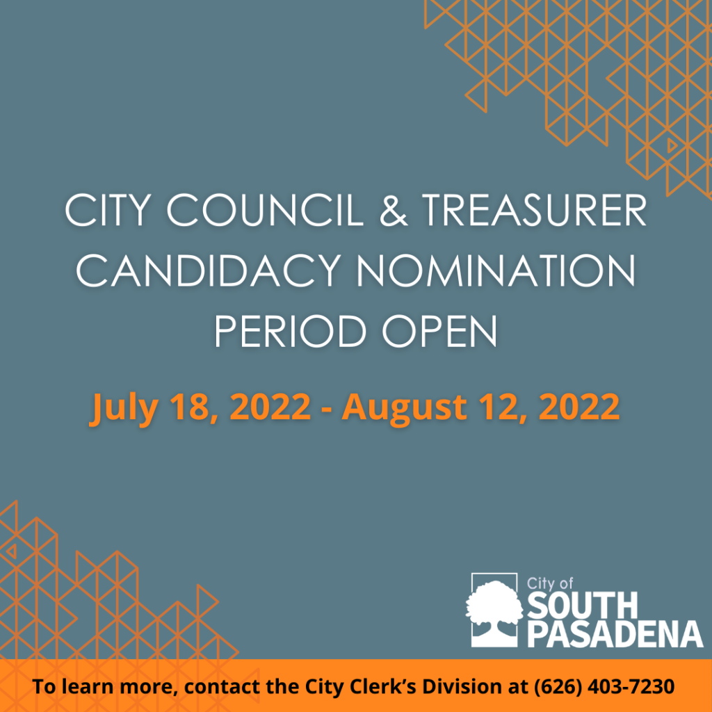 The filing period for residents interested in running in the 2022 South Pasadena General Municipal Election will open Monday, July 18, 2022, and close Friday, August 12, 2022. Two City Council seats, one in District 4, and one in District 5, and an At-Large City Treasurer seat, are open for election. If an incumbent whose term expires in 2022 does not file in this period, the filing period is extended to 6 p.m. on Wednesday, August 17, 2022, for all potential candidates other than the incumbent(s) who declined to file.