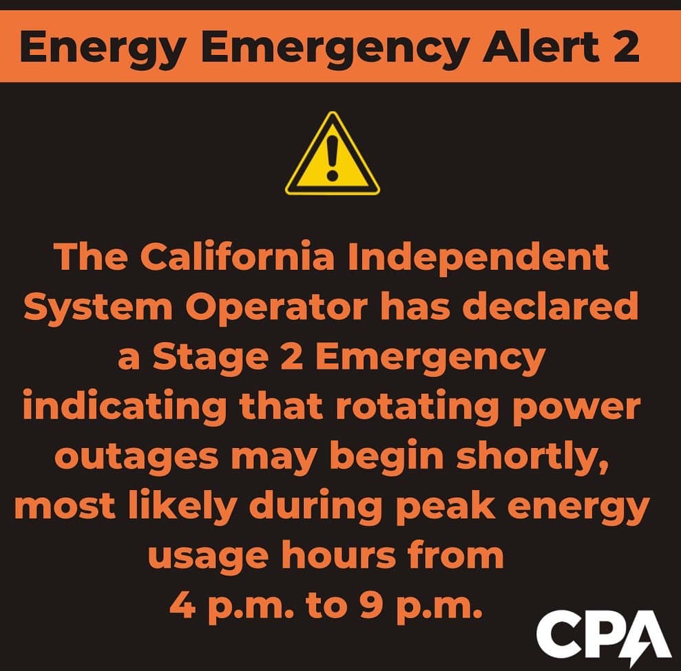 The California Independent System Operator (CAISO) has declared an Energy Emergency Alert (EEA) 2 and could soon elevate the alert to an EEA 3, indicating that rotating outages may begin shortly. Rotating outages, should they occur, typically last about one hour and take place across the state regardless of energy provider.