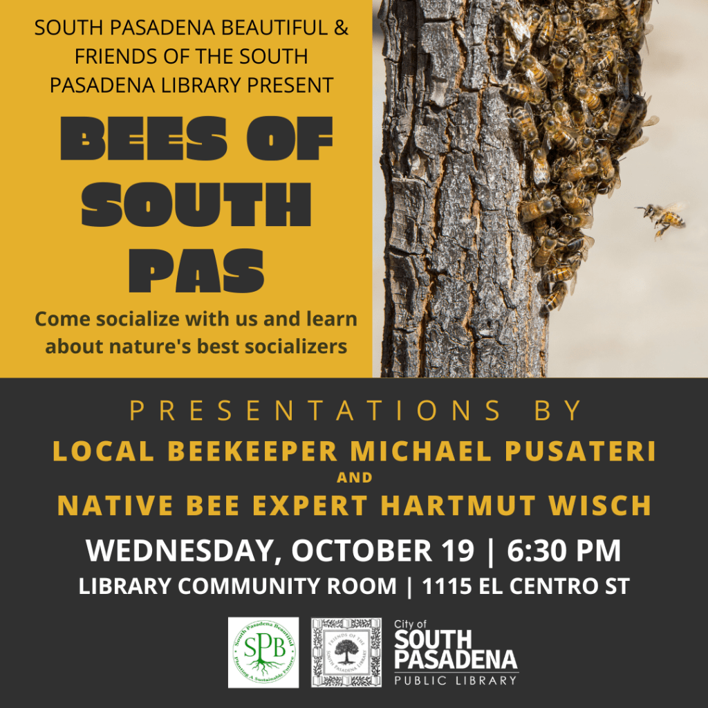 Get the buzz on bees from local experts! On Wednesday, October 19th, at 6:30 p.m. in the Library Community Room local beekeeper Michael Pusateri and native bee expert Hartmut Wisch will present on South Pasadena’s bees. This event is presented in partnership with the Friends of the South Pasadena Public Library and South Pasadena Beautiful. Doors open at 6:00 p.m. (1115 El Centro Street).