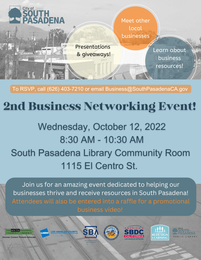 The City of South Pasadena invites all local businesses to our second Business Networking Event on Wednesday, October 12, 2022!