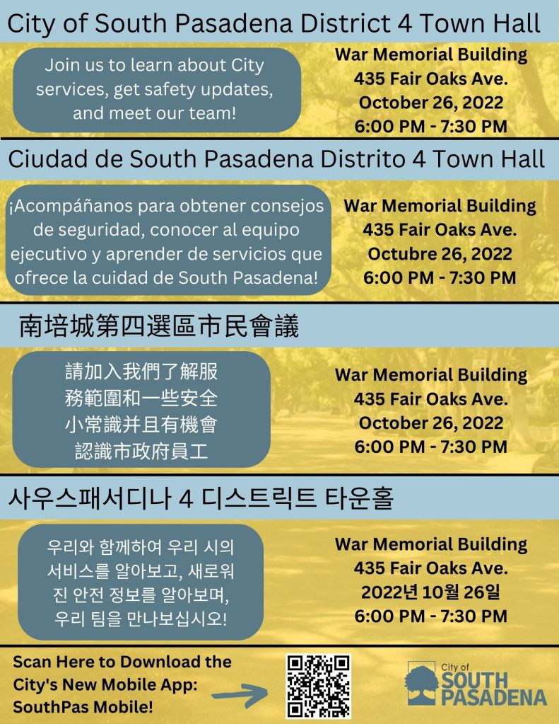 The City of South Pasadena will be hosting a District 4 Town Hall for residents and businesses in the area to learn about City services, safety updates, and give attendees an opportunity to meet City staff. The townhall will take place at the War Memorial Building located at 435 Fair Oaks Avenue from 6:00 PM – 7:00 PM.