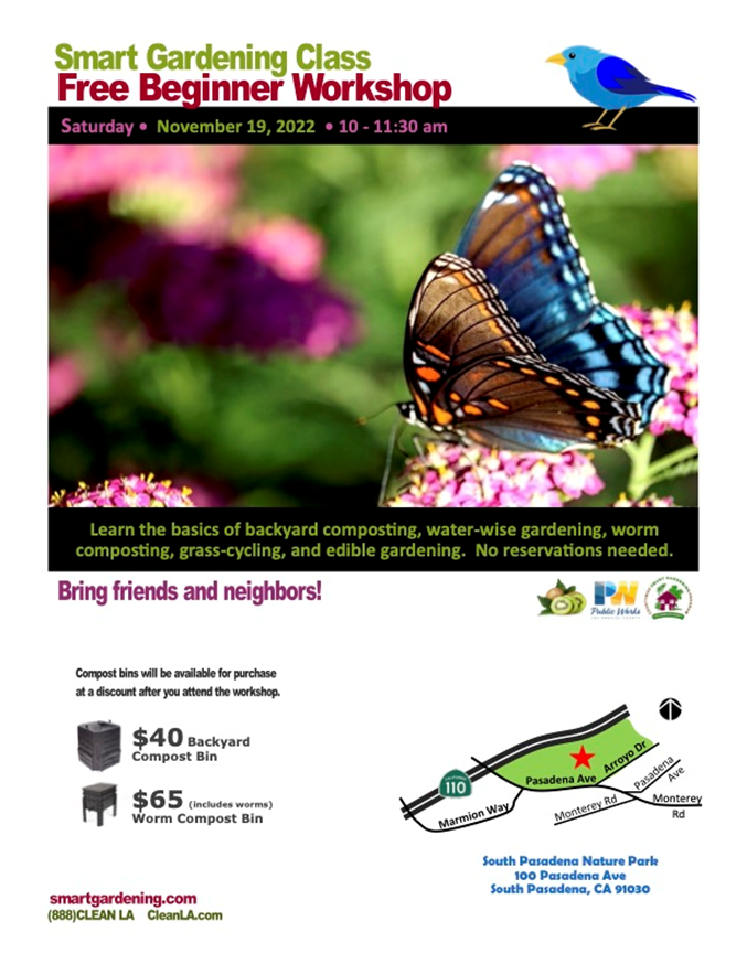 Join South Pasadena Sustainability at the South Pasadena Nature Park on November 19 from 10 AM to 11:30 AM. This is a free event hosted by Los Angeles County Public Works. At this FREE workshop, you will learn the basic techniques of backyard composting, worm composting, water-wise gardening, and edible gardening. No reservations are needed. After the workshop, there will be discounted compost bins available for purchase!