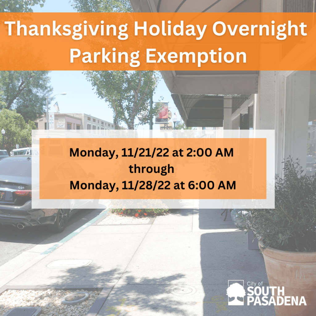 The following overnight parking exemptions will take place for the Thanksgiving Holiday: