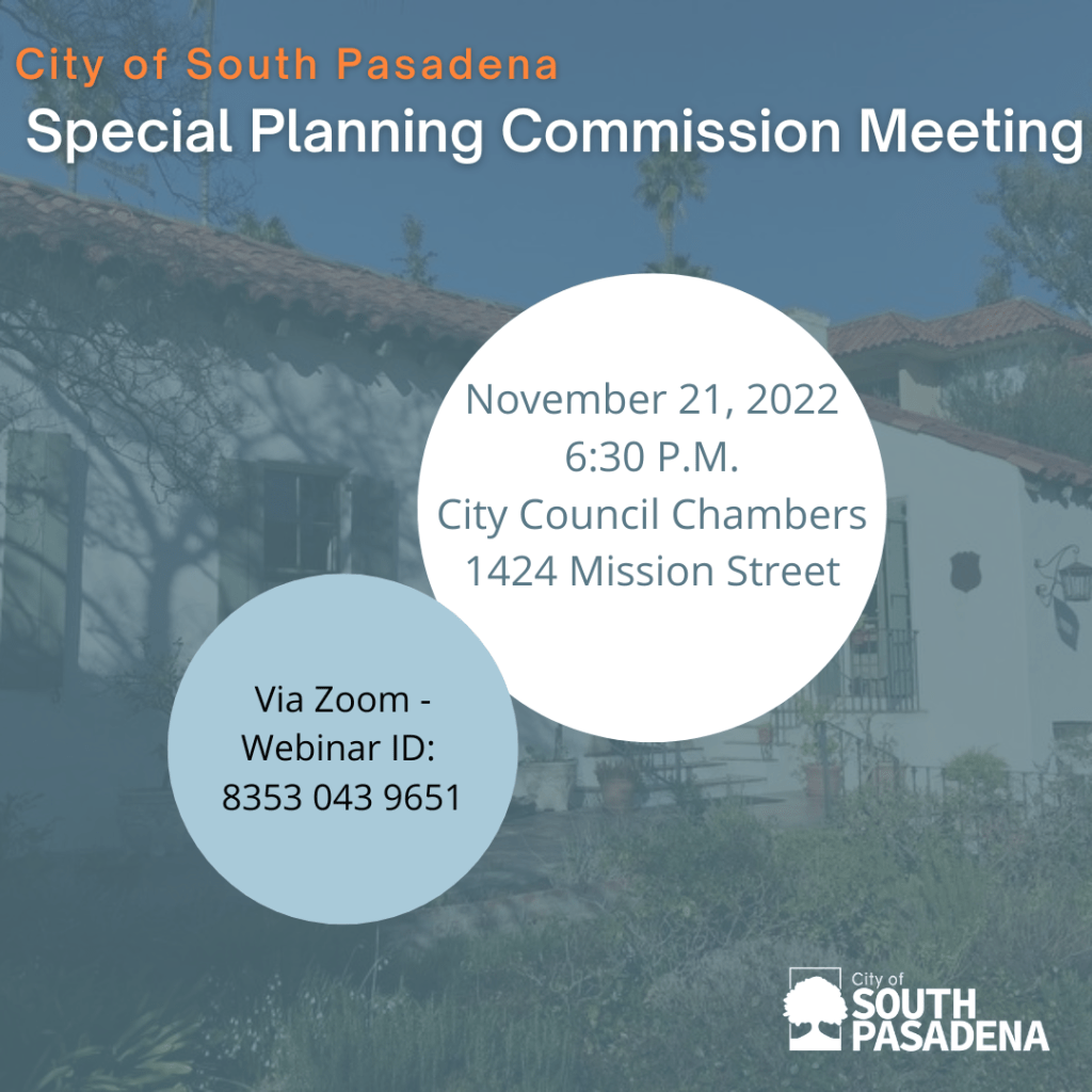 Join us tonight on November 21, 2022 at 6:30 PM for a Special Planning Commission Meeting. The meeting will be available in a hybrid in-person and virtual format. The agenda for the meeting could be found by clicking here. We look forward to seeing you there!