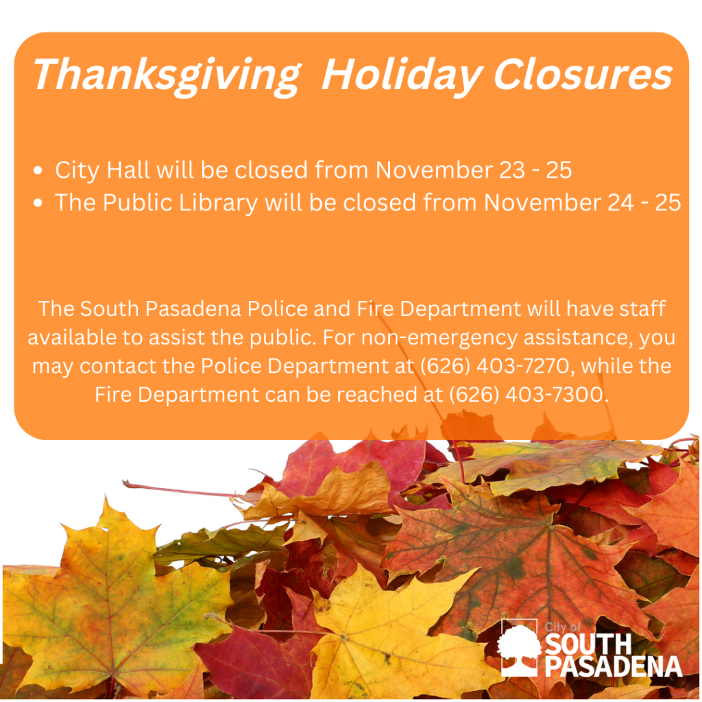 In observance of the upcoming Thanksgiving holiday, the following closures will be taking place: