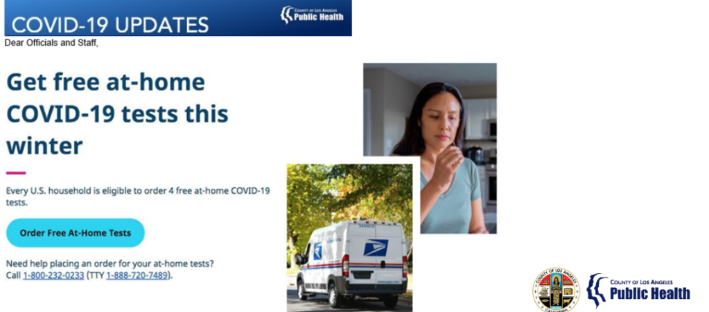 Great news! Each household can place one order for four free at home COVID-19 test kits through the U.S. Postal Service. The orders will begin to ship out next week.